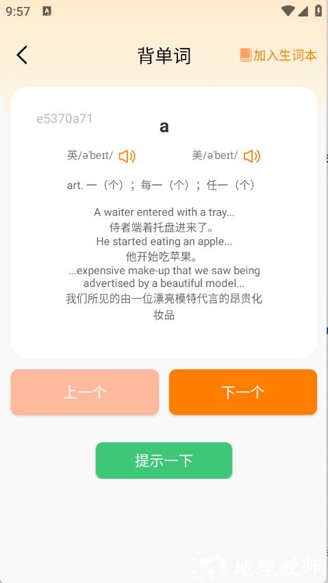 4、遇到不熟悉的单词,点击 “提示” 按钮,可查看该单词的详细信息,辅助理解记忆。