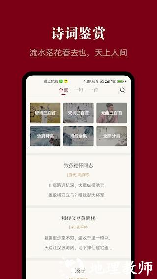 2、 汇集先秦至明清诗词曲赋经典作品,支持多维度检索,配有详尽解析以体会文学意境。