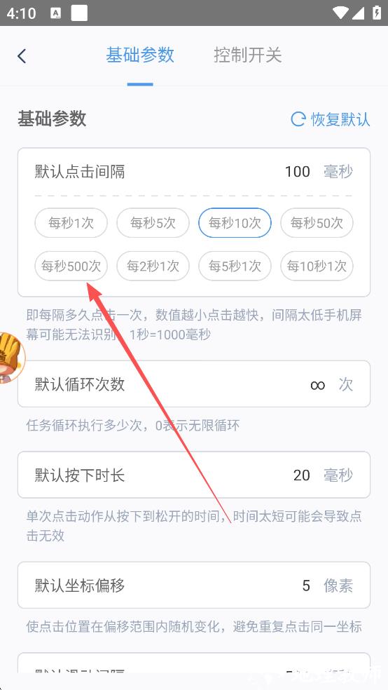 2、找到默认点击间隔和默认按下时长,调整至最短即可达到最快速度!