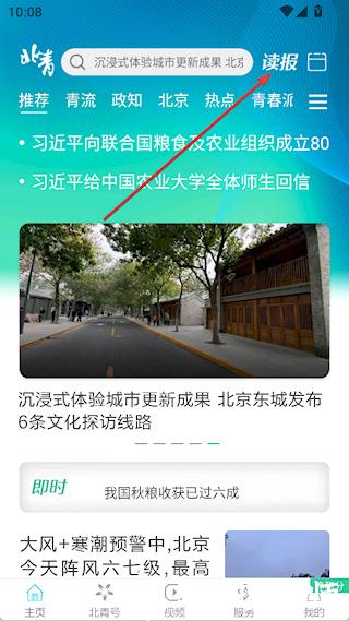1、打开北京青年报客户端,在主页点击右上角【读报】