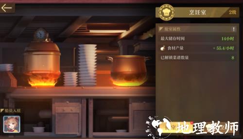 烹饪室:通过挂机可以产出食材,食材可以烹饪出英雄升级道具及提升角色默契道具。