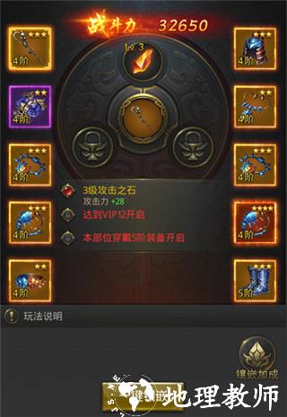 每件装备有三个宝石孔,达到相应条件后将逐一开启。不同装备有固定可镶嵌的宝石,例如武器镶嵌的是攻击之石,衣服镶嵌的是生命之石。同时人物累计宝石等级每10级可获得加成,各项属性和战力将获得大幅提升。而宝石等级可以通过宝石合成提升,每3个宝石即可合成获得更高级的宝石!