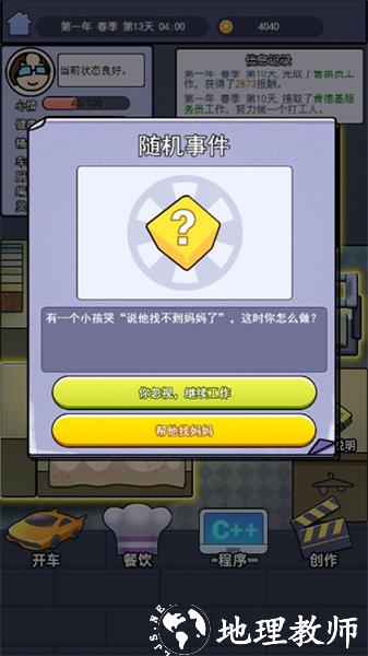 游戏过程中、工作、娱乐均会有概率触发不同的随机事件,选择事件后也会产生不一样的结果,而这些结果可能会带来不同的奖励和惩罚。
