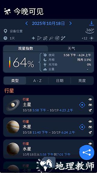 3、点击望远镜图标可以查看各个天体的可见时间段