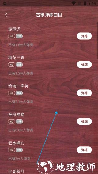 2、能够进入古筝练习曲库,点击弹练启动训练