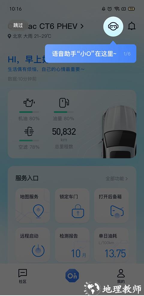 1、下载安装安吉星APP,它可以实时监控和操作汽车,同时享受全新安全驾驶与环保驾驶服务。启动后会看到语音助手“小O”,可通过语音交互了解车辆状况