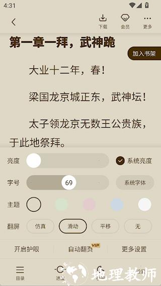 3、阅读界面可以设置翻页、亮度、字号等外观属性