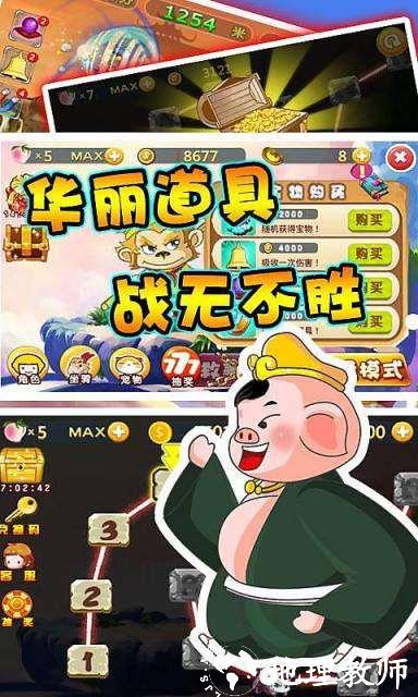 游戏中,你将扮演孙悟空、猪八戒、唐僧中的一位,通过跑酷的方式,消灭途中大大小小的妖怪,一路奔袭到牛魔王的老巢,与其展开生死大决战。你需要克服种种困难,努力地跑出更远的距离,跑得越远,你打击boss的时间越长,对牛魔王的伤害也就越大。