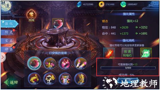 1、强化:在游戏中可以通过强化提高装备的固定属性数值 ,而且每个部位所增加的属性都不一样,强化材料需要【强化符】,但是需要注意的是,强化的时候有一定的成功几率,强化等级越高成功几率越低,但是在强化装备的时候放置祝福石就能提高强化成功率,或放置保护符能使装备强化失败时不掉落等级。当然了,道友不必为强化失败后过于悲伤,因为在强化失败后强化进度条也会增加相应的数值,当进度条满后就会直接强化到特定等级哦~还有一定很重要,装备强化等级可以完全继承到新装备上,道友们可以放心大胆的去强化,同时达到一定强化等级和装备数量还可以获得额外的属性加成哦。