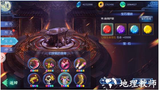 3、宝石:在宝石页面中,可以在装备上镶嵌宝石,提升主角战力,人物共有8个装备部位,每个部位可镶嵌4颗不同的宝石,一件装备的宝石孔在初始状态下只开放3个,使用打孔符开启心的宝石孔,武器、项链、戒指、护手只能镶嵌攻击类宝石,帽子、护甲、护腿、鞋子只能镶嵌防御类宝石,在拥有三颗同级多余的宝石可以合成更高一级的宝石。