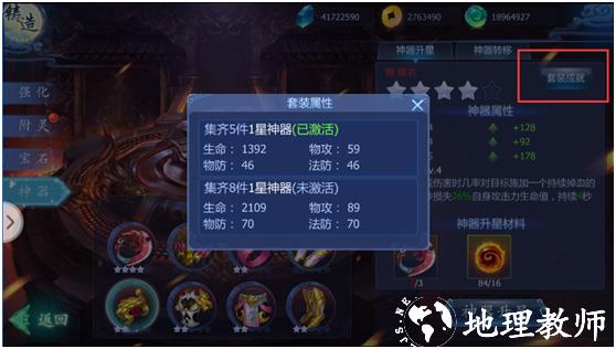 4、神器:角色到达60后开启锻造神器系统,神器最低要求60以上的橙色装备,一件装备最多可以升到5星,1~2星所需材料是该装备同部位低20级的橙色装备三件和神器精魄,3~4星所需材料是该装备同部位低10级的橙色装备三件和神器精魄,5星所需材料是该橙色装备的三件和神器精魄,仅武器和衣服带有神器技能,达到一定的装备数量和星级还可以获得额外的套装属性加成,神器转移能够将神器星级消耗一定的灵石转移到新的装备上,但只能是同一个部位。