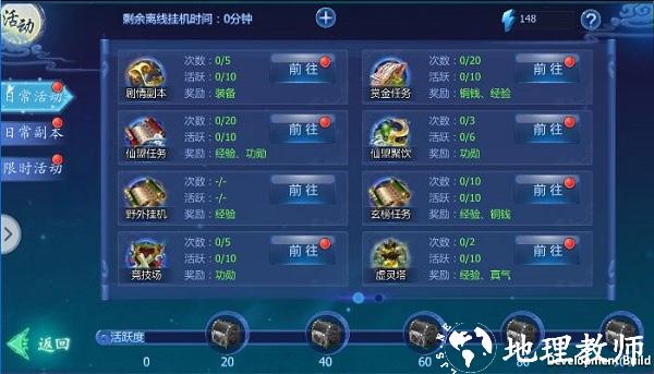 点开活动界面可以参与赏金任务、剧情副本、仙盟任务以及玄榜任务获得海量经验,另外还可以参与小炎界等多人副本以及虚灵塔来获得大量的经验,在日常任务做完后,我们可以到野外对应的挂机场景挂机,也是可以获得不少经验的哦。