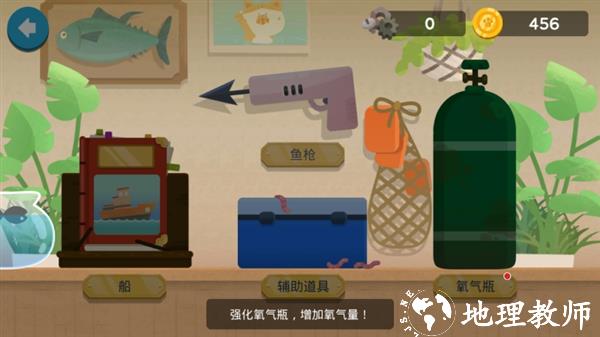 1、升级与开图、优先升级氧气瓶延长捕鱼时间,金币和零件需节省使用,开新地区靠买特定船只,100% 探索当前地区解锁深海区。