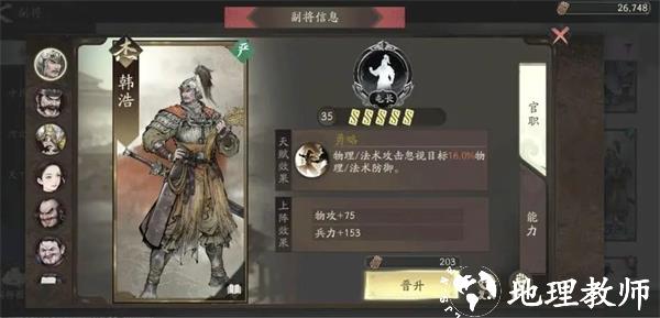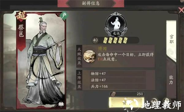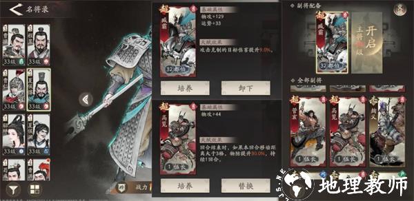 5、副将选择首推臧霸,进一步强化夏侯惇的输出能力,以及稍微加点暴击率,雪恨一圈暴击的画面也是美如画,同时加强克制能力。当40级解锁2号副将时,可以携带高览,夏侯惇基本上移动一定会超过3格,那么主属性纯攻击特技加防的高览就可以进一步强化夏侯惇的续航能力。