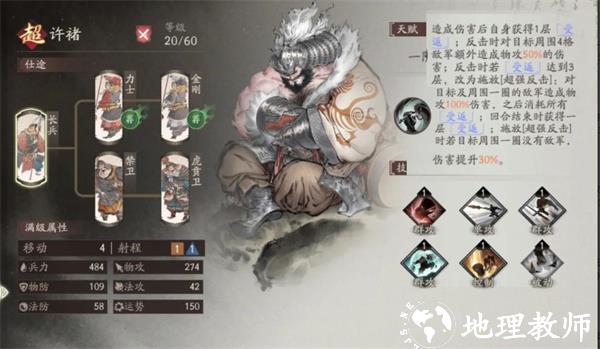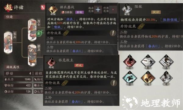 2、分支选择方面,许褚的两个分支强度都在线。金刚线有着高暴击类似狂战士,而虎贲卫线更偏向纯坦,可以根据自己的其他主将阵容选择,不同分支的技能选择也不同。高伤害的金刚线适用于单体BOSS的情况,阻挡移动,换位配上强制决斗的裸衣,一个人就能拖住BOSS,避免BOSS秒掉脆皮的情况。高坦度的虎贲卫线适用于敌人小兵较多的关卡。除了法抗和运势比金刚低,其余面板都要优于金刚。可以迅速进入战场并且群体控制,还顺便叠满被动。