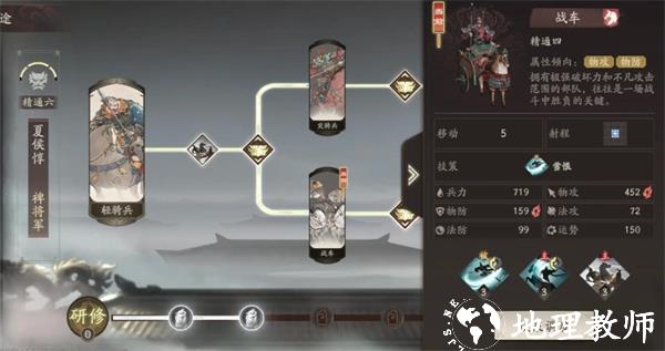 3、分支方面必须选择战车线,因为战车的攻击范围是一圈,而骑兵只有4格,在触发雪恨的时候完全不是一个概念,而且多打到人也能吸更多血,保证了夏侯惇的续航,而这一点移动力也不重要了。