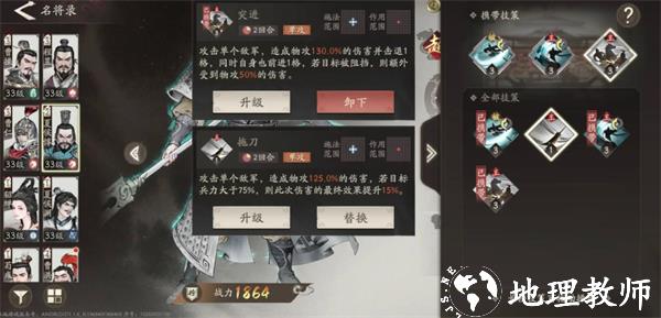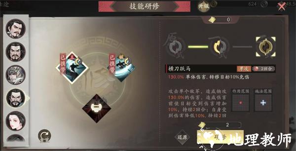 2、由于中勇义烈是后期技能,前期拿不到,所以我们可以用突进技能或者另一条线的拖刀技能先过渡一下,突进技能当敌方相邻时可以造成高额伤害,而敌人分散的时候可以带上拖刀计,不同关卡可以看情况切换。