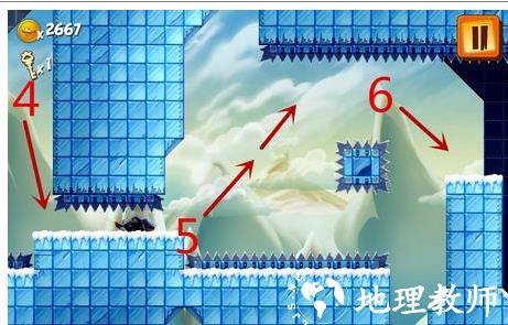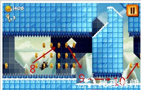 1.在企鹅下落到1的位置时,手指在屏幕上往上滑,让企鹅跳到小平台上。