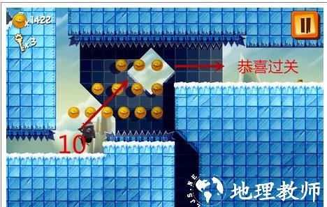 8.最后一步,在10号位置用手指迅速在屏幕上往上滑,让企鹅跳到上面的平台,恭喜你终于过关了!