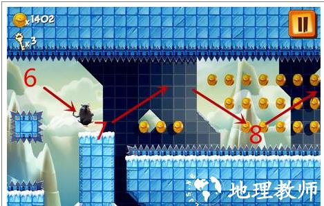 6.在6号小平台要准备好三连跳,三连跳其实也不难,7号位置快速起跳,落到8号位置的时候再次用手指在屏幕上往上滑动再跳。