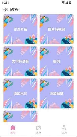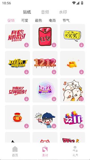 3、“素材”界面提供丰富的贴纸、音频与水印