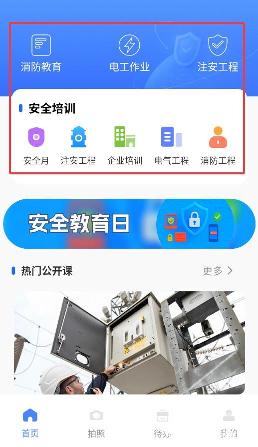 2、在首页功能区,可选择消防教育、电工作业、注安工程及安全培训等专业课程。