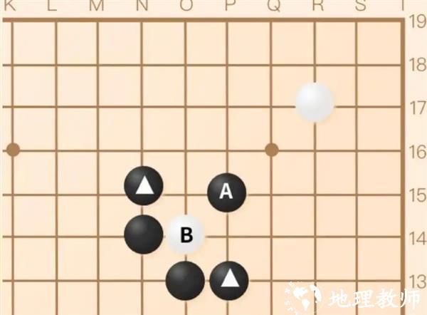 如图所示,黑棋A 并没有直接紧到白棋的气,但却与两个黑△子同时形成了两扇门(可以与关门吃联系起来),等于同时堵住了白棋B两边的出路,这种吃子方法就叫做枷吃。