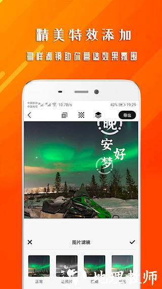3、拥有大量独特的视觉特效与滤镜,如阳光光斑、胶片质感、自然光影及天气元素等。这些叠加效果能轻松为图片增添艺术氛围,提升整体表现力。