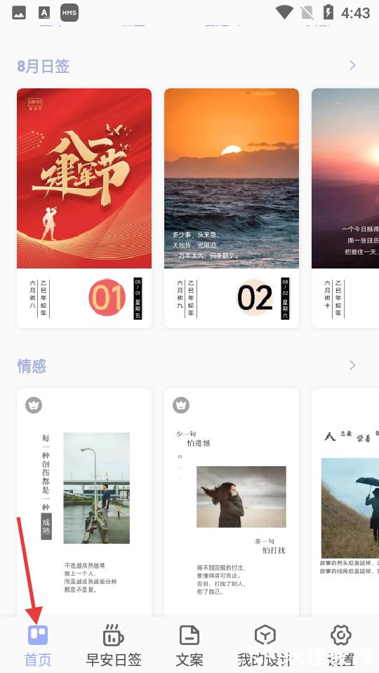 1、首页每日更新当月主题日签,例如八月重点展示建军节等节日内容。同时设有情感专栏,分享生活感悟类短文,所有内容均以图文结合的形式呈现。