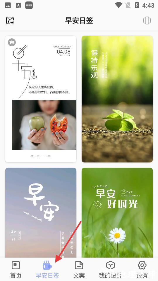2、早安日签专区集合了大量清晨问候主题的模板,视觉风格以明亮清新为主。每款设计都搭配励志格言或温暖语句,旨在传递一日之初的正面能量。