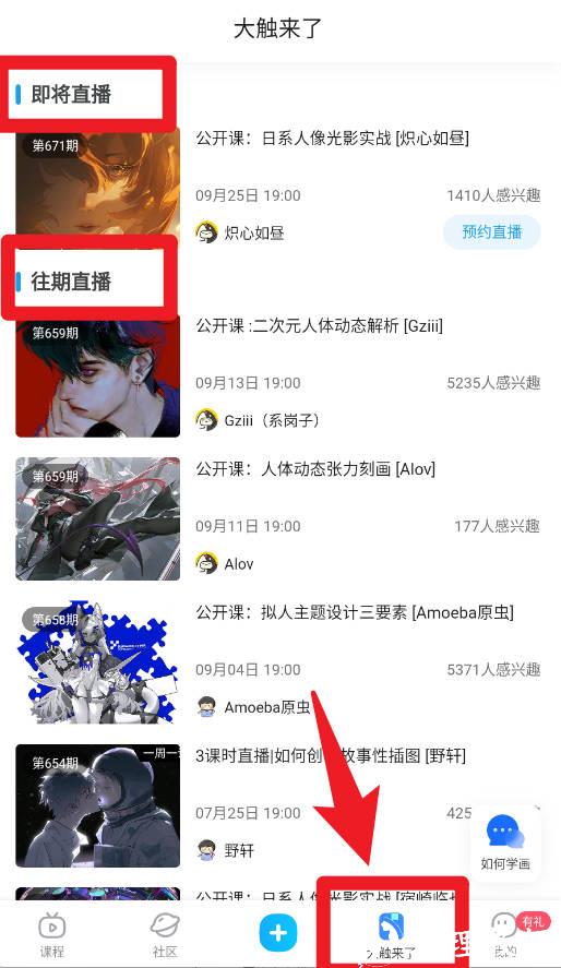 4、大触来了专区提供即将开课和往期课程直播,用户可自由预约或回看,学习知名老师的专业经验。