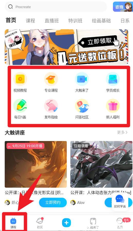 1、在线课程学习:提供多类别绘画教学视频,支持随时回放观看。