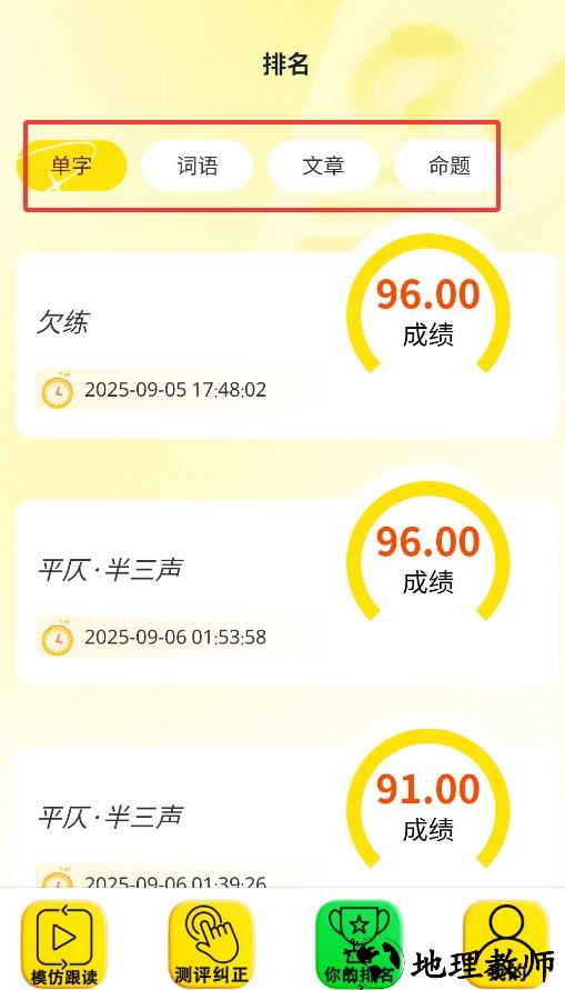 4、进入排名页面后,可通过单词、词语、文章及命题练习提升语言能力。