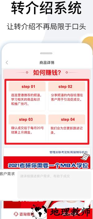 3、通过转介绍系统,按照步骤推荐商品并分享内容,确认成交后即可获得收益。