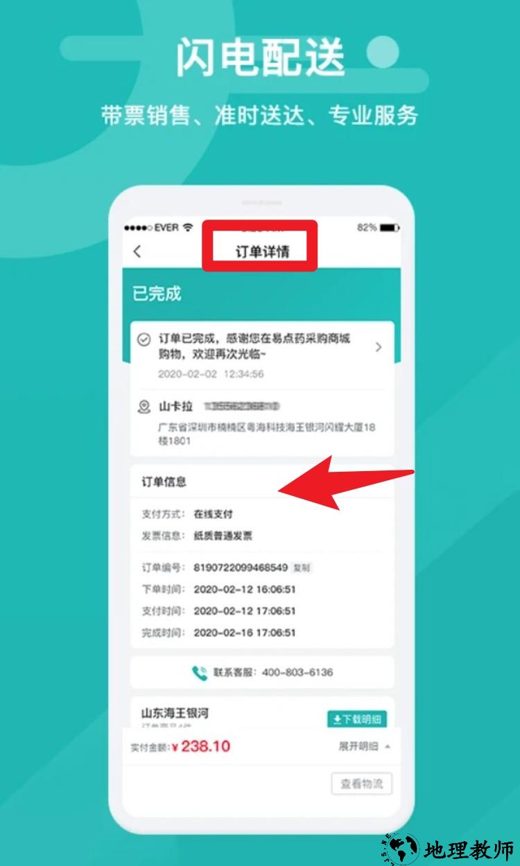 4. 完成订单后进入订单详情页,可查看配送状态、付款方式、发票类型与下单时间等完整信息。