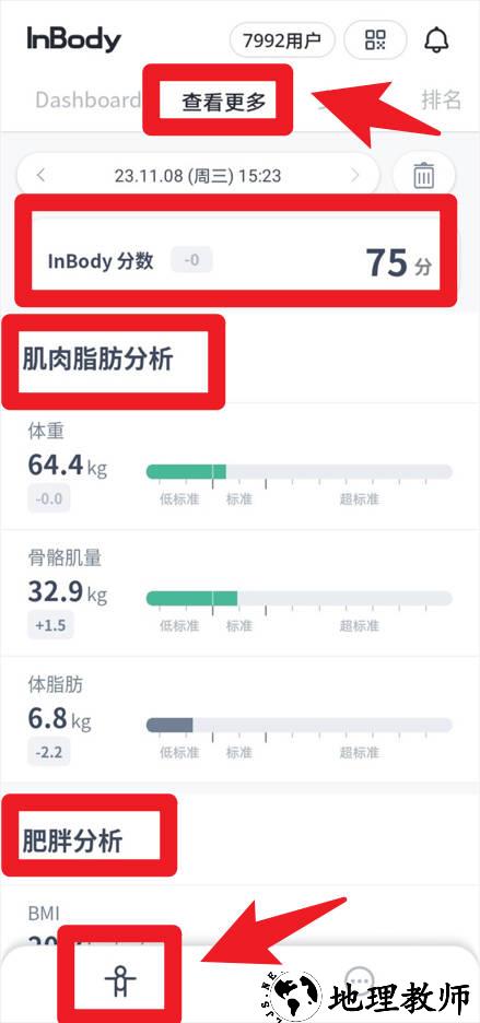 3、更多详情页面支持查看inbody分数、肌肉脂肪分析以及肥胖分析等内容,提供全面的健康评分和身体组成数据。