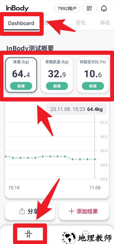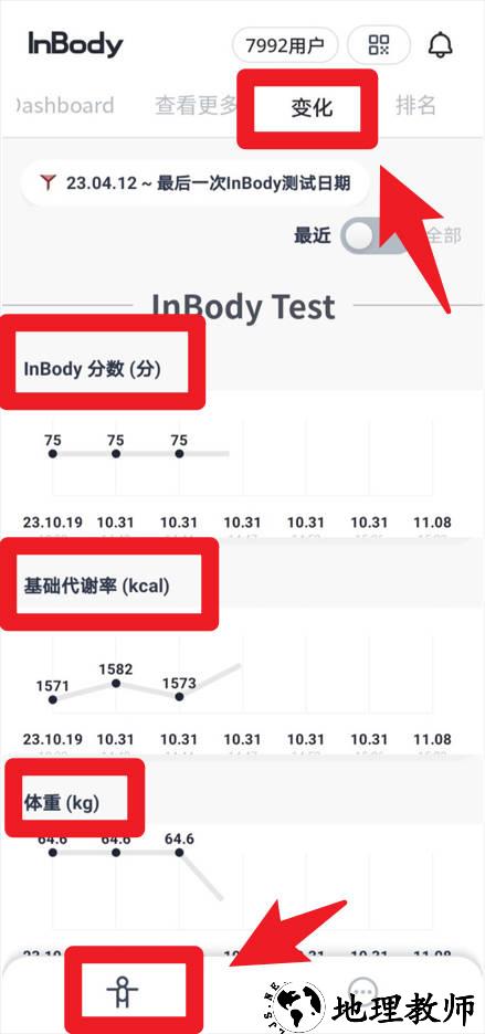 4、变化页面展示不同时间段的身体变化趋势,包括inbody分数、基础代谢率和体重变化,方便跟踪健康管理的进展。