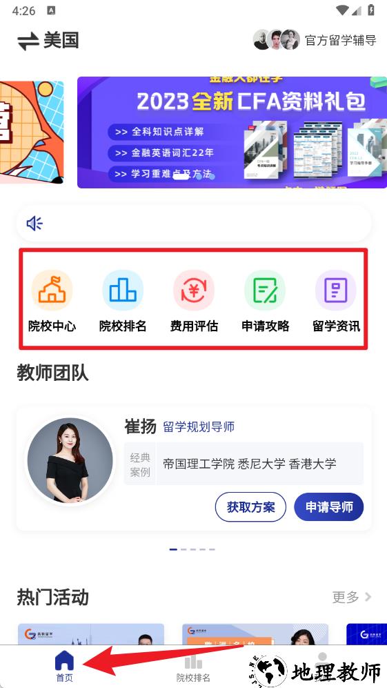2、在首页可以查看院校中心、院校排名、费用评估、申请攻略及留学资讯等服务。