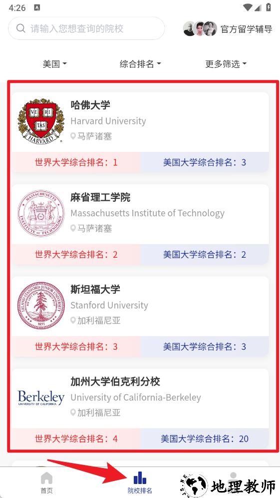 5、切换到院校排名,可查看各大学的全球及本国排名,方便择校参考。