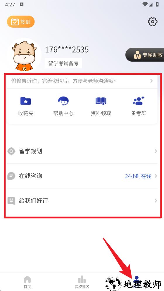 6、在我的页面可查看收藏夹、帮助中心、资料领取和备考群,并支持留学规划与在线咨询。