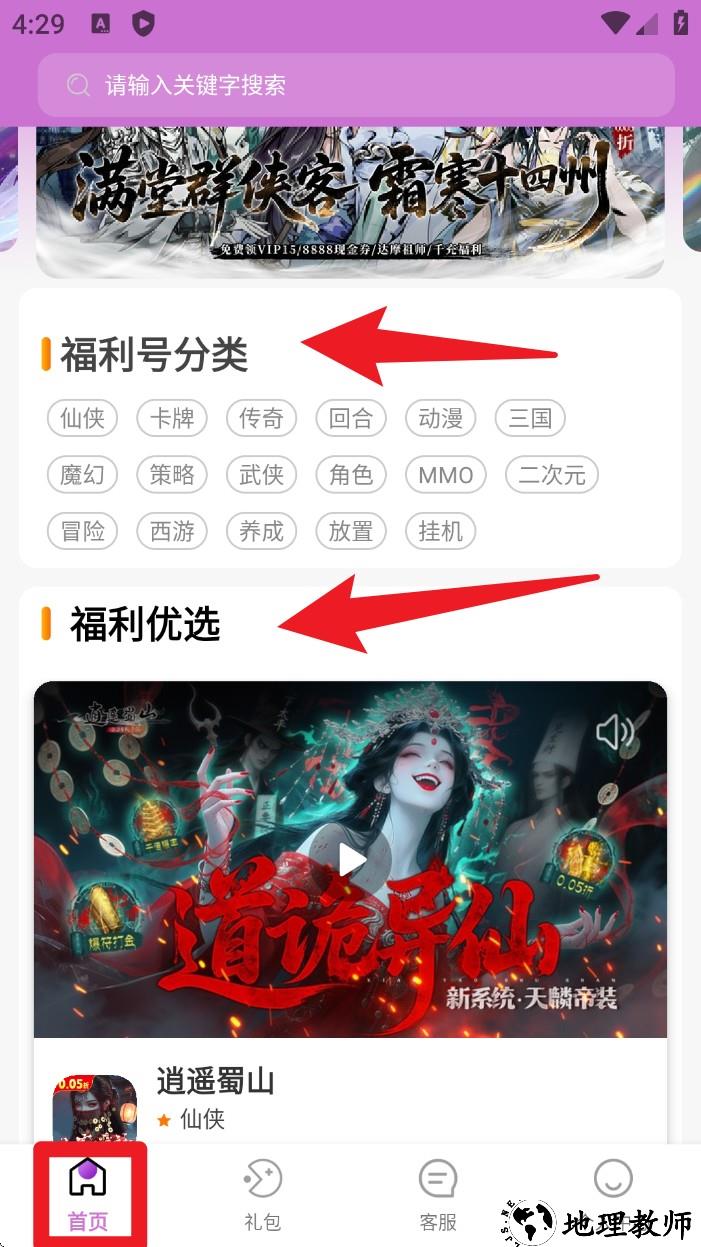 1. 进入首页后可浏览福利号分类与福利优选模块,按题材快速筛选喜欢的手游类型进行查看。