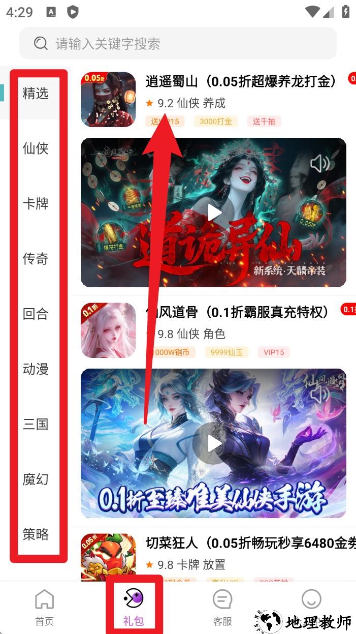 3、齐全游戏分类:涵盖仙侠、卡牌、传奇、三国等类型,支持快速筛选。