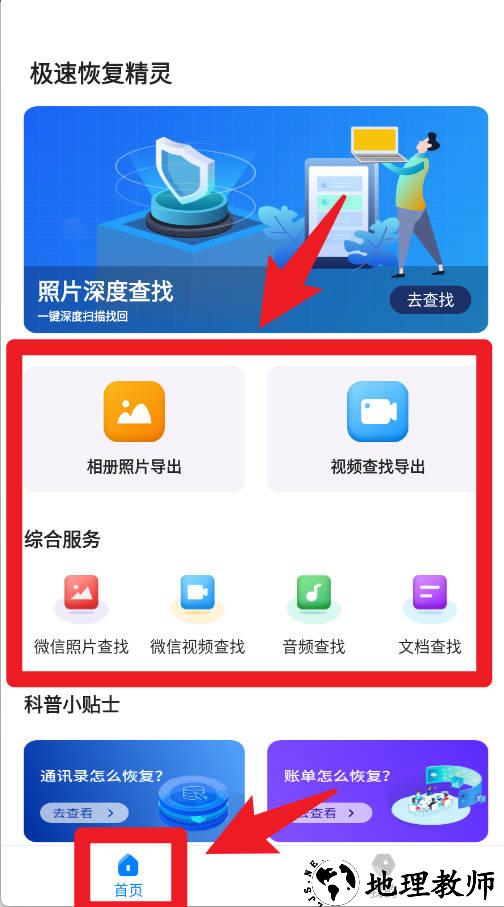 2、首页功能区提供相册照片导出、视频查找导出等综合服务,同时支持微信照片、音频及文档的深度查找。