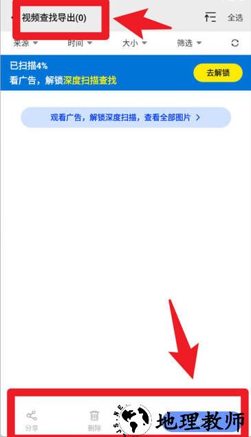 3、视频查找导出页面会显示已扫描的视频数量,用户可以在这里对扫描结果进行分享或删除。