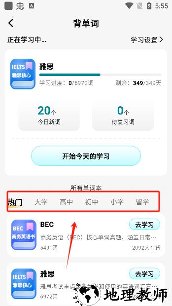 3、点击模块顶部的单词书列表,从中挑选适配自身水平的教材,点击即可启动学习。
