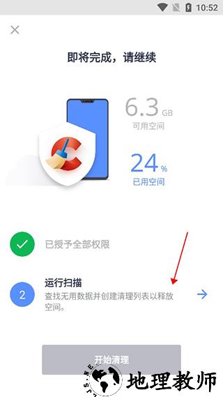 3、权限授予完成后,点击 “运行扫描”,软件将开始检测手机中的各类垃圾文件。