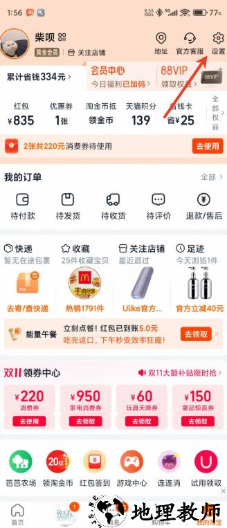 2.点击我的淘宝后点击右上角设置,