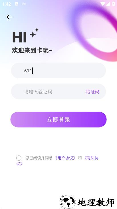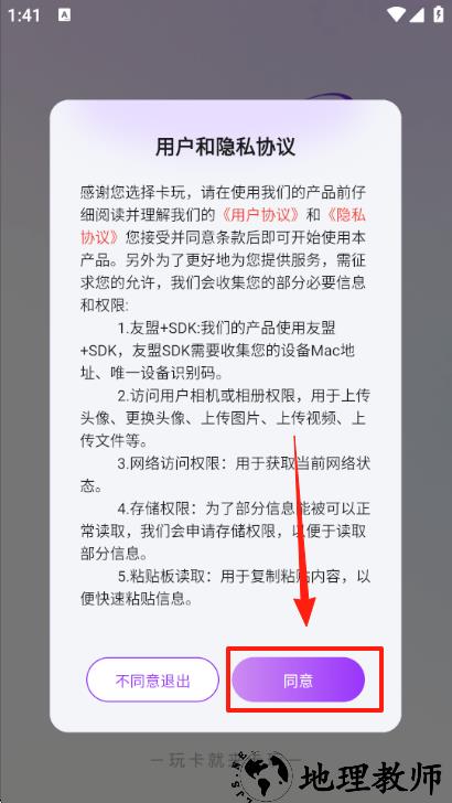 1、打开卡玩 app,仔细阅读隐私协议后点击同意,完成初始使用权限确认。