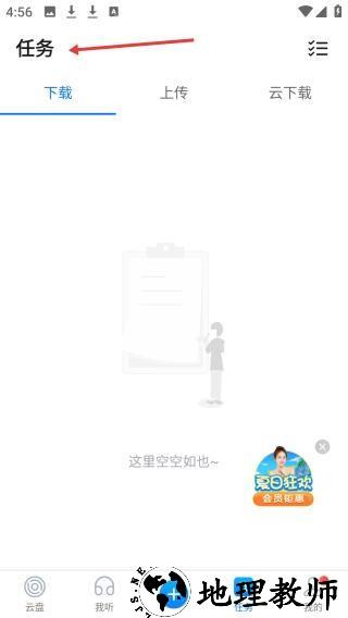 3、进入任务界面,包含下载、上传、云下载等分类选项,当前无相关任务,页面呈空白状态。
