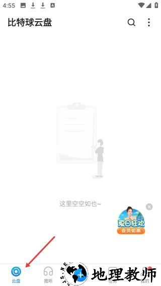 1、打开比特球云盘主界面,选中底部云盘栏目,当前云盘内未存储任何内容,界面设计清爽直观。